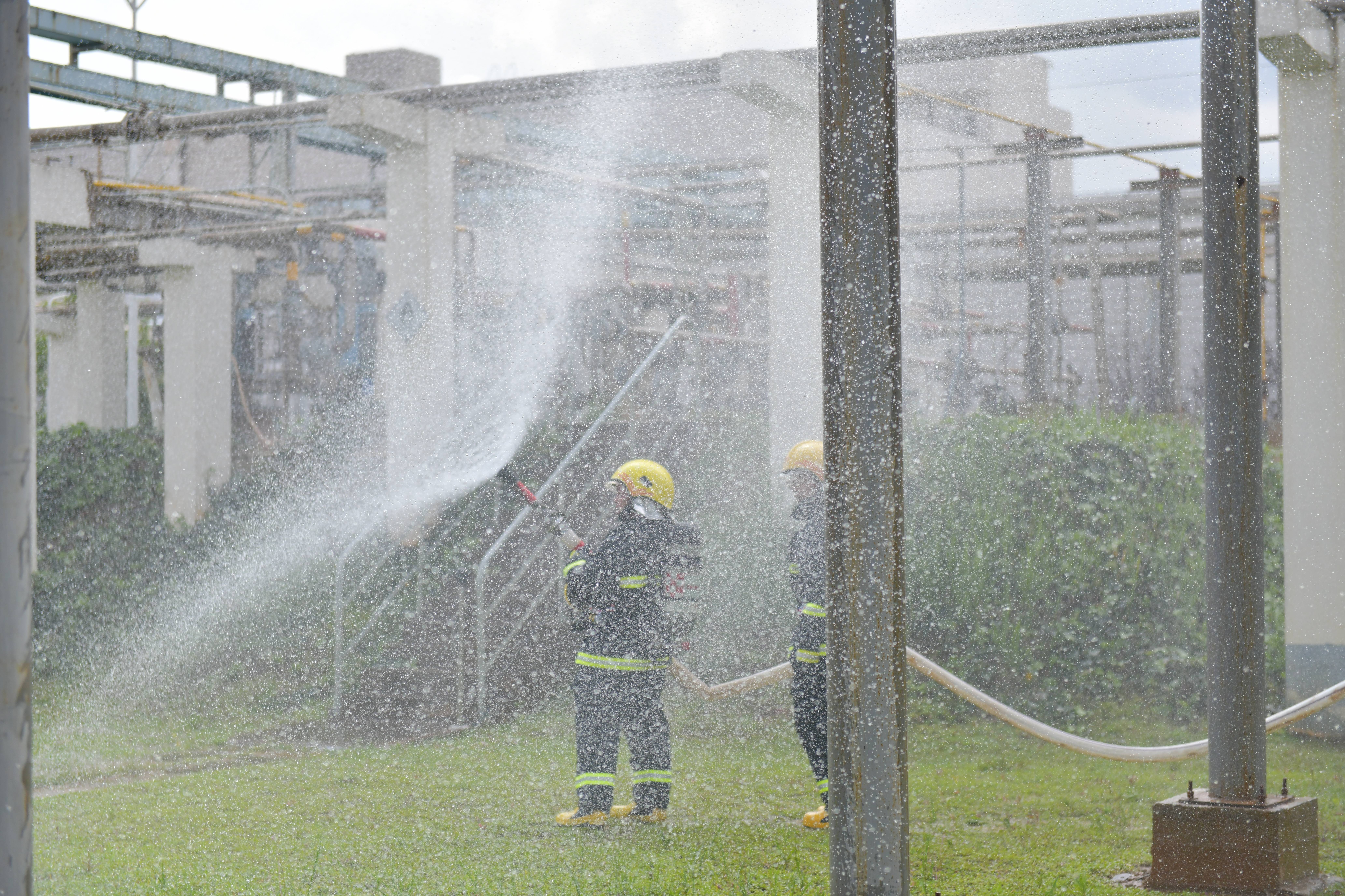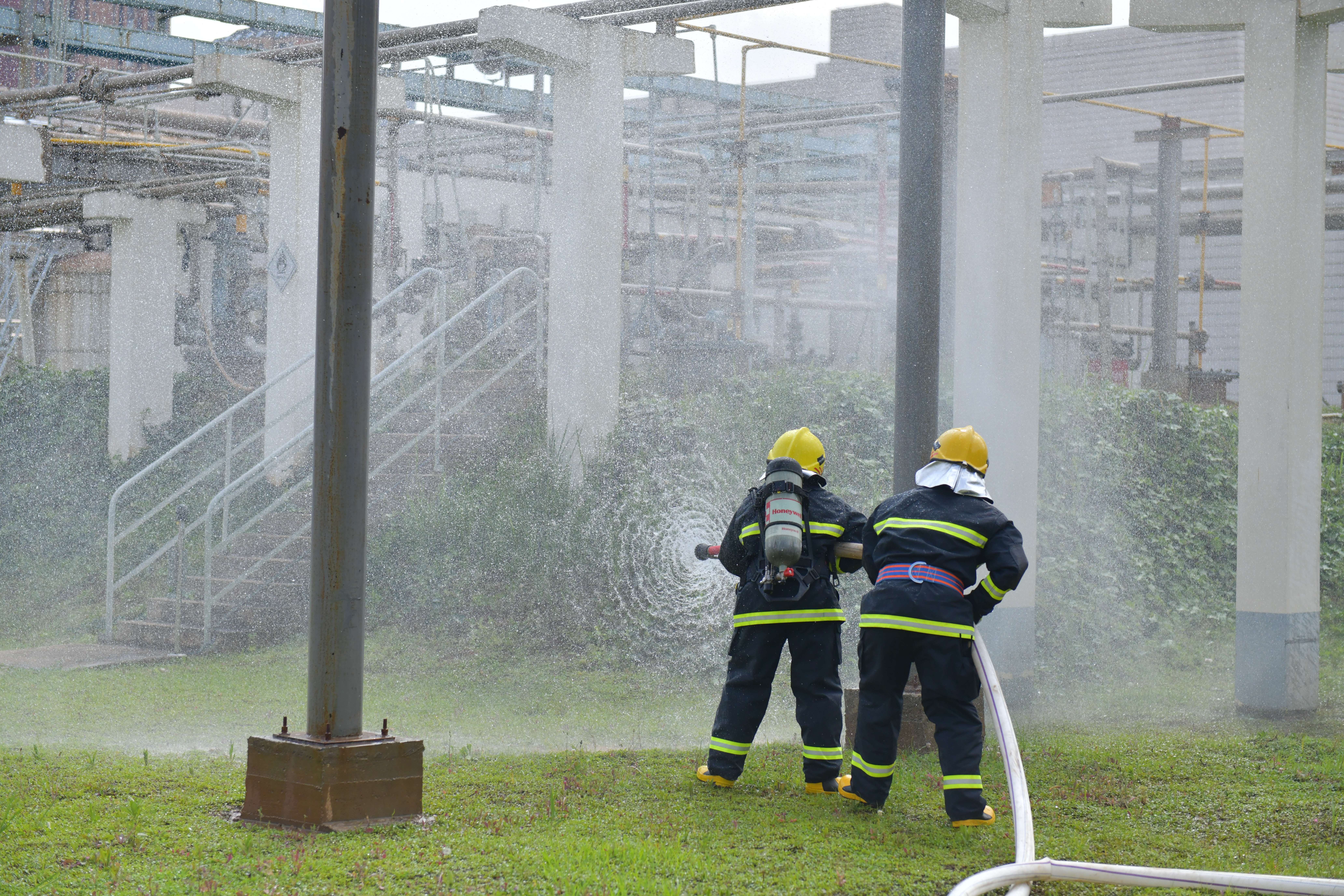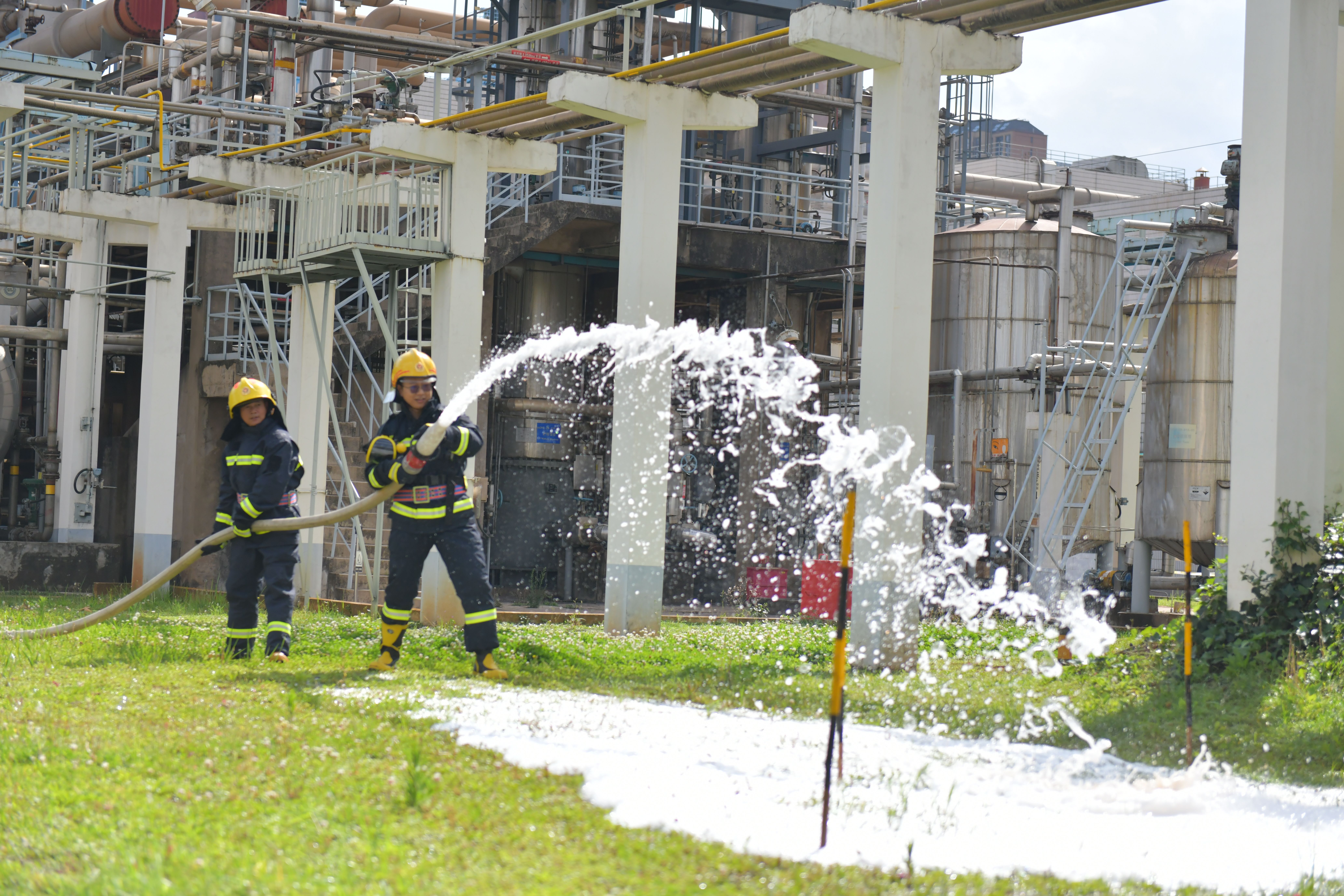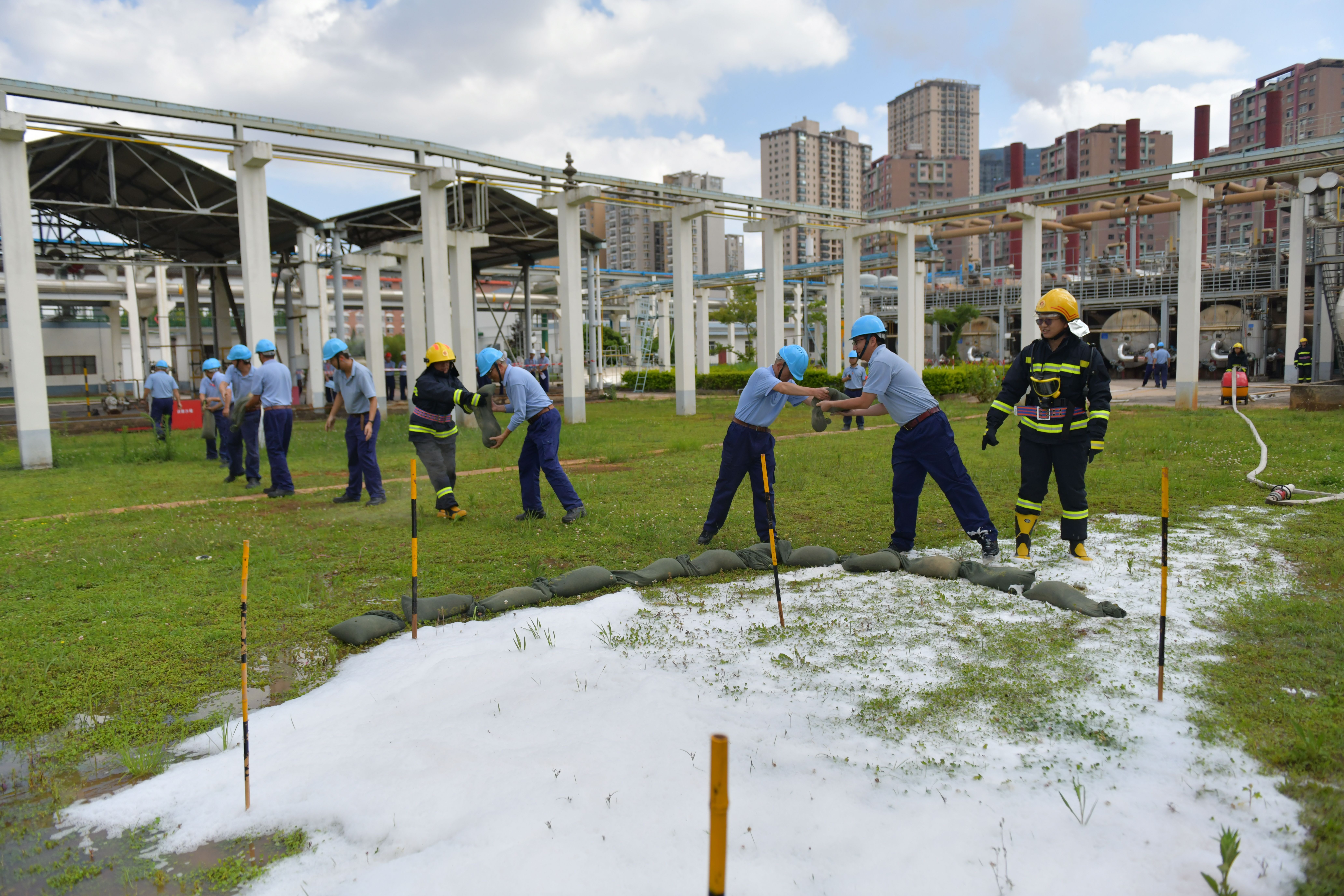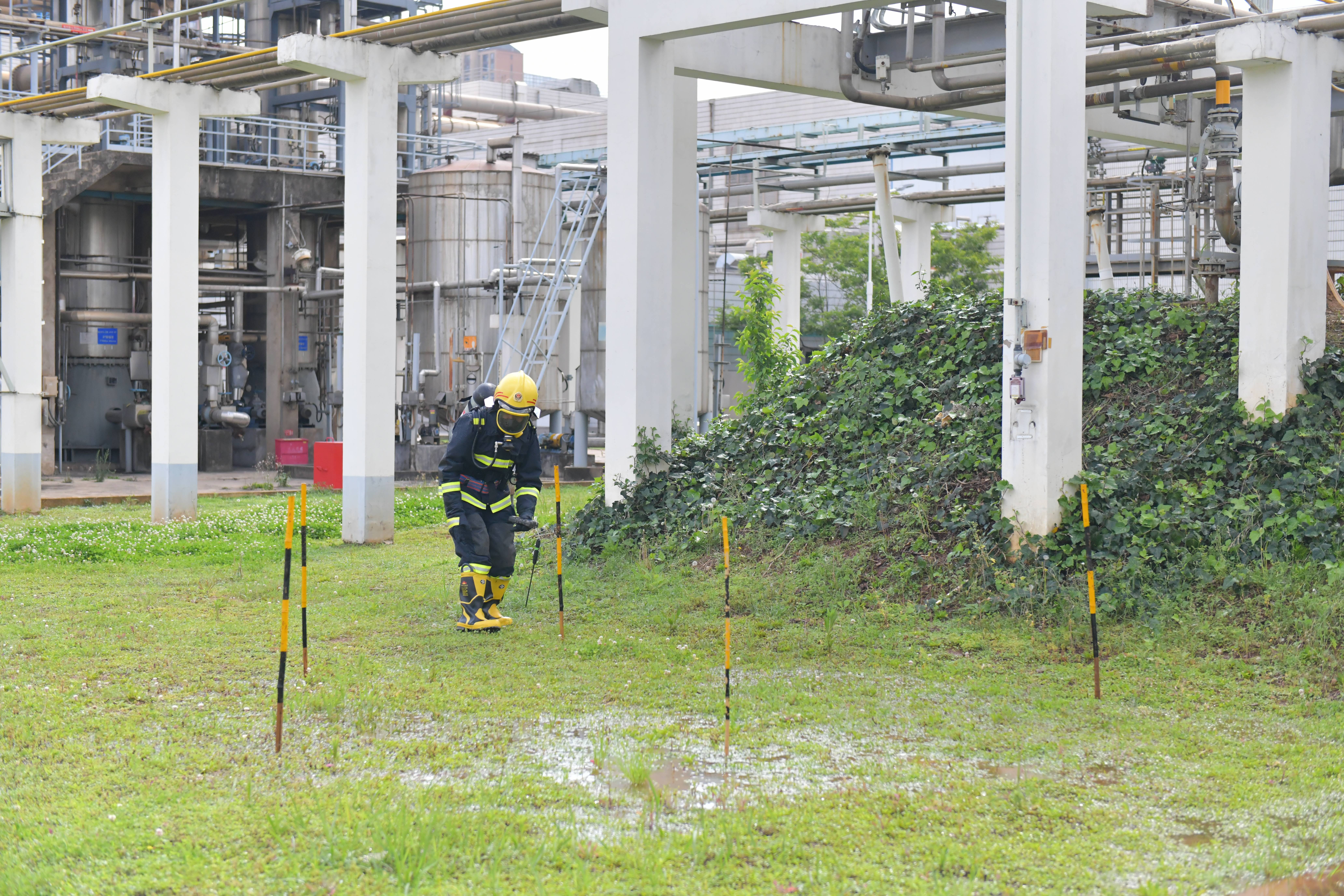 本次演練分為兩個(gè)內(nèi)容,一是丙酮儲(chǔ)罐區(qū)發(fā)生丙酮泄漏后的應(yīng)急處置,二是全廠緊急撤離。下午4點(diǎn),演練正式開始,模擬丙酮儲(chǔ)槽區(qū)4#丙酮儲(chǔ)罐1#泵出口管道法蘭發(fā)生泄漏,可燃?xì)怏w探測(cè)系統(tǒng)發(fā)出丙酮濃度高報(bào)警,值班長(zhǎng)立即通知消防中心拉響警報(bào),召集當(dāng)班應(yīng)急隊(duì)員集合。應(yīng)急隊(duì)員到達(dá)現(xiàn)場(chǎng)后關(guān)閉液下泵出口閥,用開花水槍噴淋加濕泄漏點(diǎn)周邊區(qū)域,標(biāo)記出丙酮污染的區(qū)域,噴灑泡沫覆蓋泄漏的丙酮。期間模擬應(yīng)急隊(duì)員暈倒,救護(hù)組立即進(jìn)入現(xiàn)場(chǎng)救治,最后全體應(yīng)急隊(duì)員和當(dāng)班員工用沙袋搭建圍堰防止混合液體擴(kuò)散。隨后應(yīng)急廣播發(fā)出全廠緊急撤離警報(bào),全體參演員工快速有序地向第一集合點(diǎn)集合,最終全體安全撤離到第二集合點(diǎn),演練圓滿結(jié)束。此次演練檢驗(yàn)了在后援力量未到達(dá)公司時(shí),值班長(zhǎng)的應(yīng)急調(diào)度能力和指揮能力,同時(shí)也檢驗(yàn)了員工的應(yīng)急處置技能。